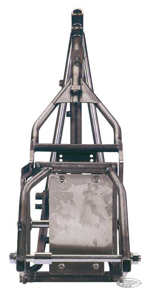Dieser Rahmen sollte nicht nur optisch glänzen, sondern auch fahrbar sein und allen Anforderungen standhalten. Ebenfalls selbstverständlich ist die Tatsache, daß alle passenden Motoren und Getriebe ohne weitere Modifikationen, paßgenau, eingebaut werden können. Für alle Eigenbauten wurde dieser Rahmen mit allen nötigen Raffinessen bestückt. Es wurden dickwandige Rohre verbaut. Der Lenkkopfwinkel wurde bei 38" festgelegt, passend für alle Standrohre inklusive der verlängerten, sowie passend für alle Vorderräder. Das Heck wurde verbreitert, für Hinterradreifen bis 200mm mit Kettenantrieb oder 20mm Belt. Alle Aufnahmen für Seitenständer und Rastenanlage sind bereits angebracht. Der Rahmen ist komplett WIG geschweißt. Kompatibel mit allen Harley-Davidson Gabeln inklusive unsere geprüften Ceriani. Passend für alle Big Twin Motoren inklusive der gestrokten Versionen sowie für 4- und 5-Gang Getriebe. Der komplette Rahmensatz beinhaltet: Rahmen, Schwinge, Schwingenachse aus Edelstahl mit verchromten Distanzringen, verchromte Hinterradachse mit verchromten U-Scheiben, Distanzringe und Mutter und Stoßdämpferschutzplatte mit Distanzringen für die Montage von 4-Gang Getrieben. Alle Teile sind auch einzeln erhältlich. Für die, die ganz von vorne anfangen, haben wir auch OEM Ersatz Schwingenlager im Lieferprogramm. Hinweis: Zodiac Wide-Tail Rahmen sind vom niederländischen RDW und werden mit deutschem Gutachten geliefert. Die Stabilität des Rahmens wurde für Motoren bis 110 PS geprüft. Diese können mit unseren geprüften Schwingen und geprüften Vorderradgabeln aufgebaut werden.