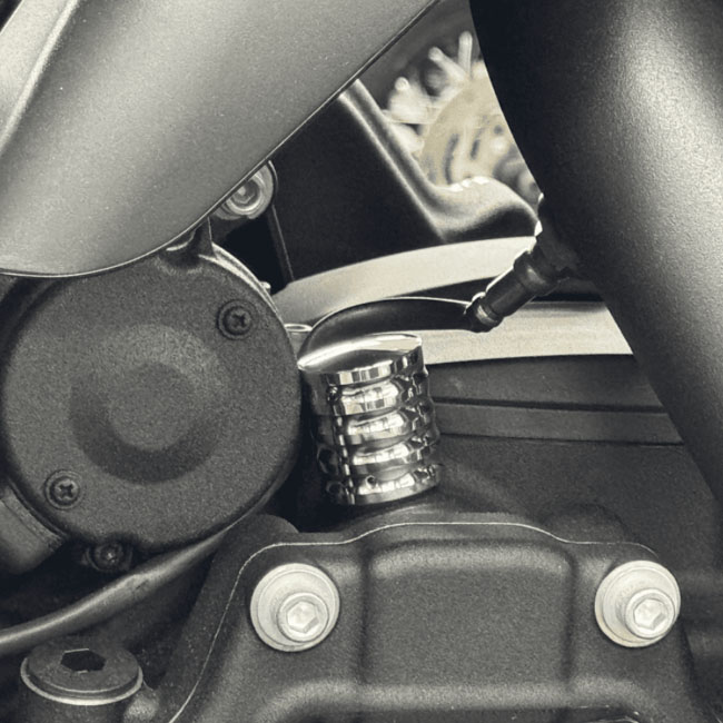 Polished finish. Horizontal milled. CNC machined billet aluminum NOS (NAMZ Original Stuff) neutral switch cover. Fits over the neutral switch and its wiring. Perfect to further improve the clean look.