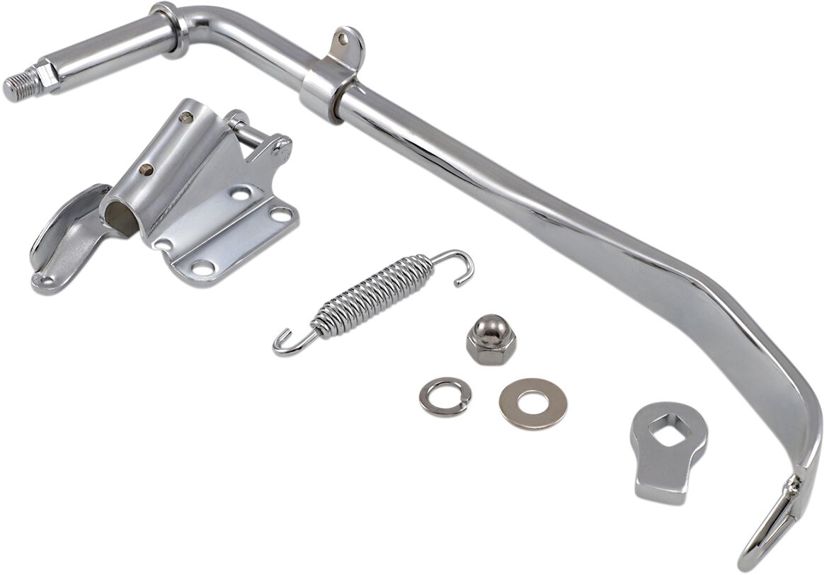 Chrom Seitenständer-Kit- Komplettset mit einteiligem, poliertem Chromhalter mit Federlasche, Seitenständer, Anschlag, Feder und Mutter.