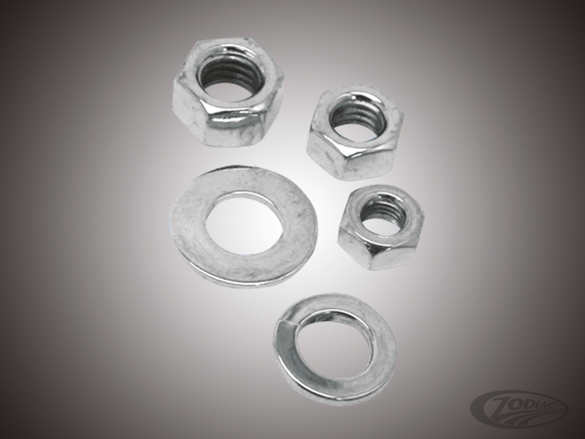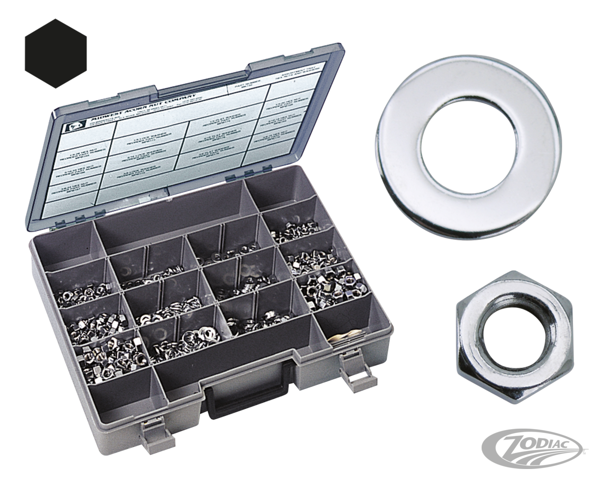 Komplettes Sortiment mit 1200 verchromten Muttern und U-Scheiben wie aufgeführt. Jede Mutter/U-Scheiben-Grösse kann auch einzeln bestellt werden.
