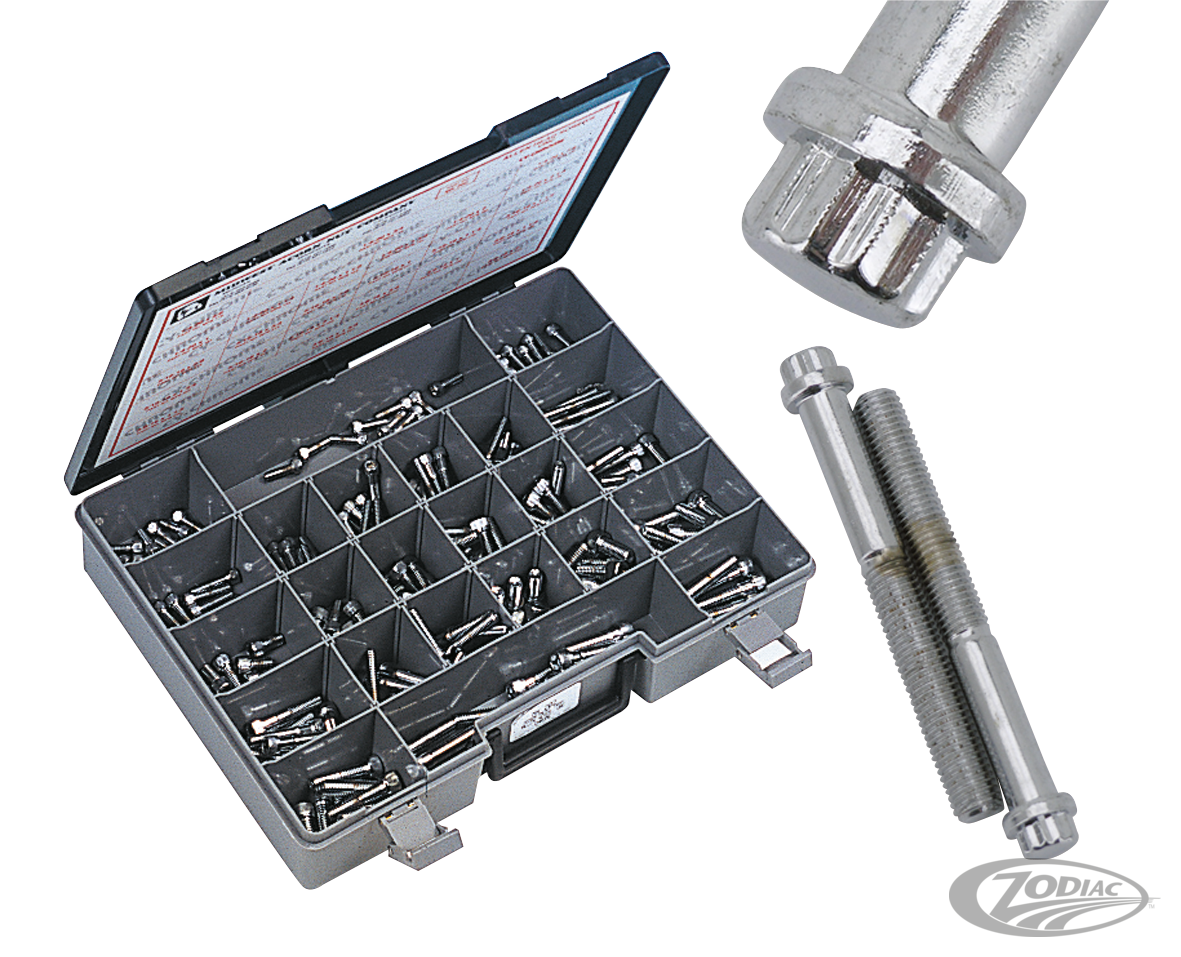 Komplettes Sortiment mit 12-Kant Schrauben, in Grade 8. Diese Schrauben werden immer öfter an Harleys verwendet. Bieten mehr Angriffsfläche für den Schlüssel und weniger Abnutzung der Schraubenköpfe. Jedes Sortiment enthält 215 Teile in UNC und UNF in 24 verschiedenen Grössen, wie aufgeführt. Jede Gewindegrösse ist auch einzeln erhältlich.