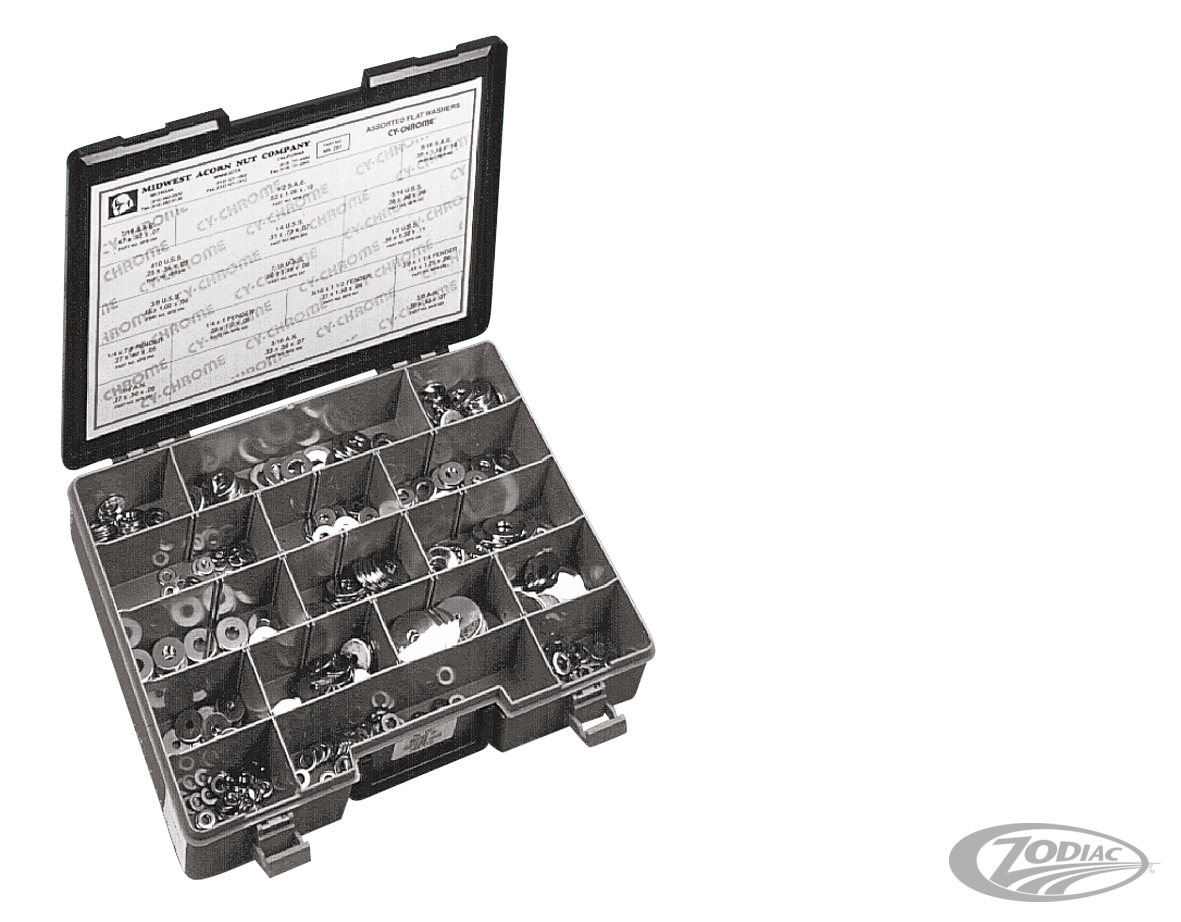 Komplettes Sortiment verchromter U-Scheiben. 16 verschiedene Grössen in AN (unten links), SAE (oben), USS (unten rechts) und für Schutzbleche. Insgesamt 475 Teile. Alle Grössen sind auch einzeln erhältlich.