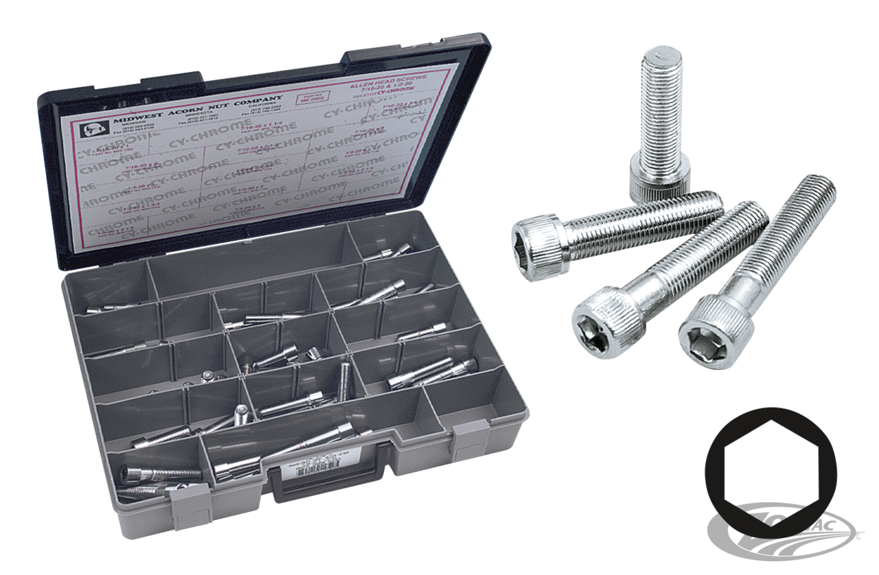 Innensechskantschraubensortiment, in Grade 8, in zwei verschiedenen Grössen 7/16" und 1/2" UNF. Beinhaltet 14 Grössen, 70-teilig. Jede Grösse kann auch einzeln im 5er Pack bestellt werden.