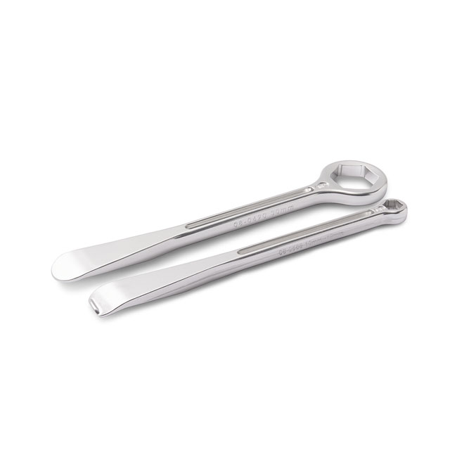 - 2 tire spoon set with versatile adapter insert - Both levers have perfectly contoured tire lever on one end - One lever has unique combination stepped 10/12 mm box end wrench on other end for rim lock nuts - Unique no-pinch tip on one lever helps protect inner tube during tire installation - Second wrench has hex box wrench for 30 mm axle nuts on other end - Made from lightweight forged 7075 T-6 aluminum - Hard anodized finish - Under 10 inches in length and weigh only 3.5 oz. - Hex ends for axle nuts are rated for a maximum torque of 90 lb/ft - Unique adapter allows use on 17 and 19 mm axle nuts
