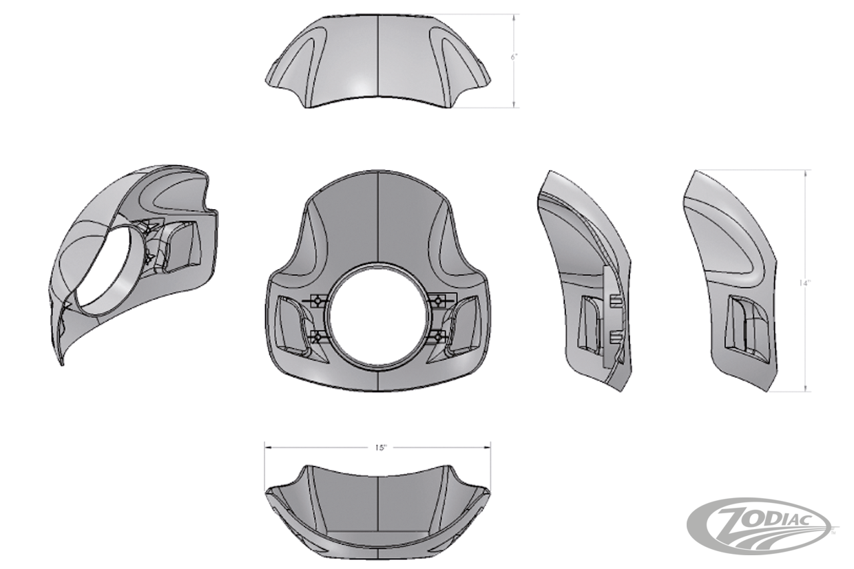 Universelle Design Verkleidungen für Verwendung von 5 3/4" Scheinwerfern. Aus gegossenem ABS und verfügen über eine schlagfeste Acryl Windschutzscheibe und schwarze pulverbeschichtete Stahl Montagewinkel für ein Vielfalt von Verstellmöglichkeiten. Für viele Modelle mit 35 bis 49mm Standrohren. Sowohl Sport als Touring Verkleidungen verfügen Ausbuchtungen links und rechts vom Scheinwerfer die sich auch gut zur Anbringung von weiteren Leuchten anbieten.