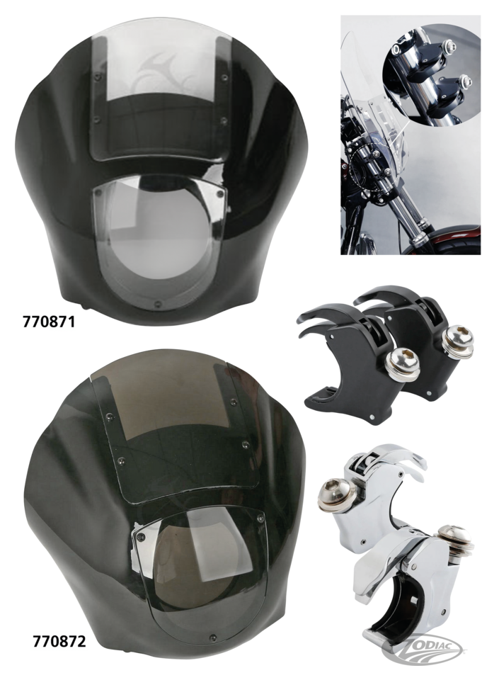 Das einfach zu installierende, aerodynamisch geformte Lenkerverkleidungsset verleiht Ihrem Bike den beliebten Café-Racer Style, kann aber auch in weniger als einer Minute wieder entfernt werden. Leider ist die Scheibnwerferscheibe nicht EU-konform. Verkleidung und zwei abnehmbare Montagesatz müssen separat bestellt werden. Beachten Sie, dass die Montagesätze für Vordergabeln geeignet sind, bei denen keine Abdeckungen über den Gabelrohren zwischen der oberen und unteren Gabelbrücke angebracht sind. Hinweis: Für diese Verkleidungen sind insgesamt vier Befestigungsklammern erforderlich. Ein Montageklemmensatz enthält nur ein Paar, Sie müssen also zwei Montageklemmensätze bestellen.