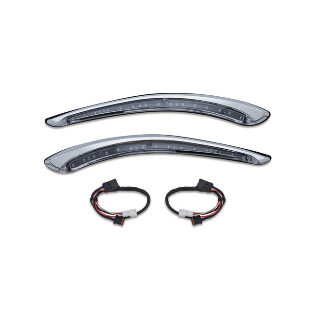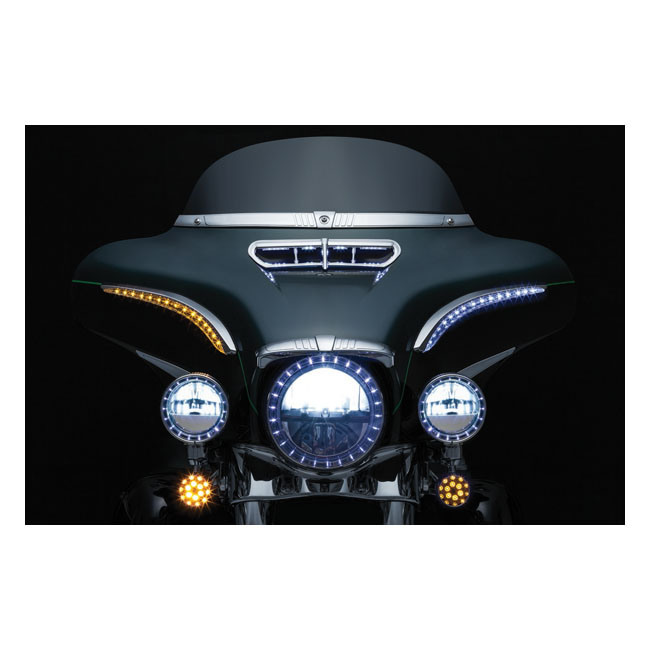 Fits FLHT; FLHX models and Trikes with the traditional Batwing fairing. Also fits bikes with the Kuryakyn AirMaster fairings.Run/turn function. No tools required. Simply peel; stick and ready. The sequential Bat Lashes come with white running lights and amber turn signals that light up individually for consistent directional illumination. Note: Requires drilling to run wiring