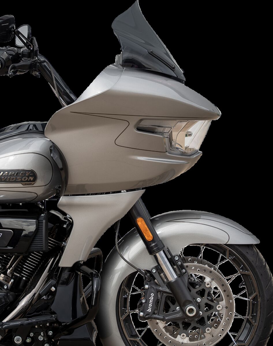 - Das patentierte Design mit seitlichen Hüften" leitet den Fahrtwind vom Fahrer ab und sorgt für mehr Abtrieb am Vorderrad, was die Stabilität gegenüber der Serien-Windschutzscheibe verbessert.