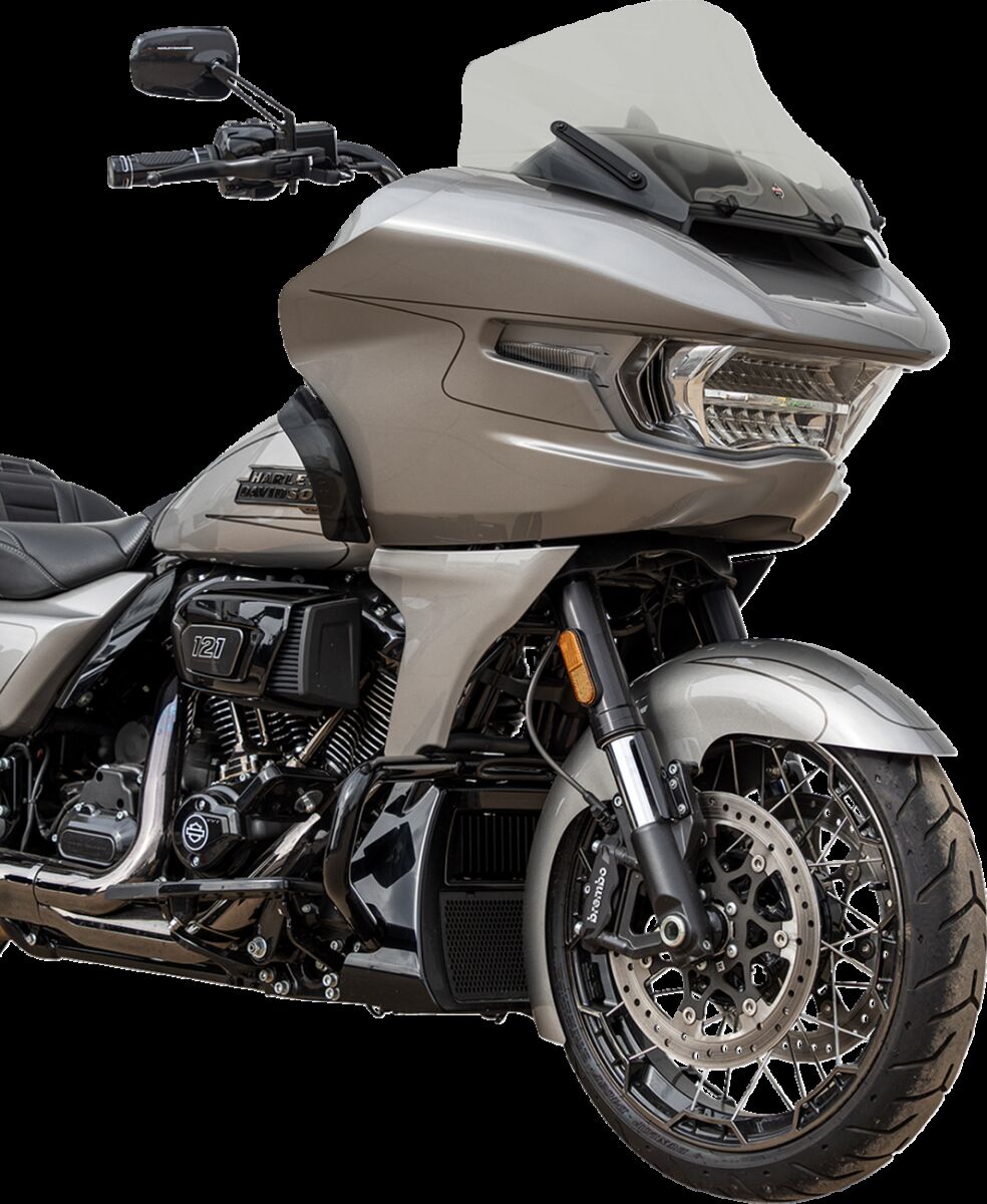 - Das patentierte Design mit seitlichen Hüften" leitet den Fahrtwind vom Fahrer ab und sorgt für mehr Abtrieb am Vorderrad, was die Stabilität gegenüber der Serien-Windschutzscheibe verbessert.
